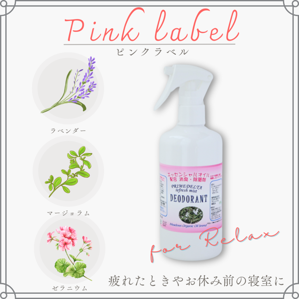 - 高ぶった気分を落ち着かせたり、ゆったりした気分を味わいたいとき、また夜眠れないときに寝室グッズにピンクラベルを適量噴霧。