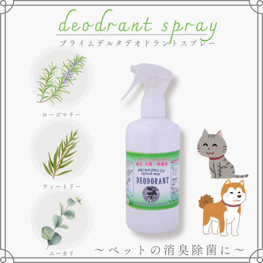 プライムデルタデオドラントの基本の原材料にロ-ズマリ-、ティ-トリ-、ユ-カリをブレンドしました。シャ-プでわずかに甘く爽やかな香りがペットの居住環境を満たします。